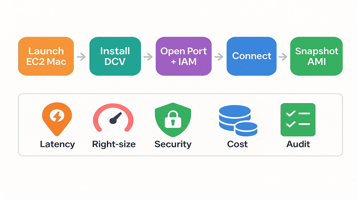 EC2 Mac instances aren’t one-size-fits-all, not even close. Pin Xcode and SDK versions, snapshot golden images, and schedule uptime around working hours. Because DCV licensing is included on EC2, most cost lives in compute. Turn things off when not in use.