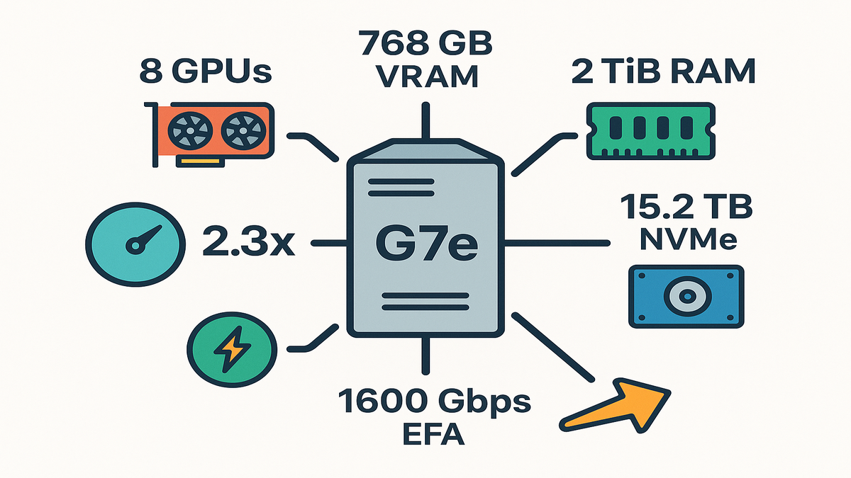 Compared to G6e, G7e delivers up to 2.3x inference performance. That compounds at scale. If your pipeline needs 10 nodes for peak traffic, a 2.3x boost can drop that to 4–6 nodes. Plus you cut cluster complexity and make your SRE team smile.
