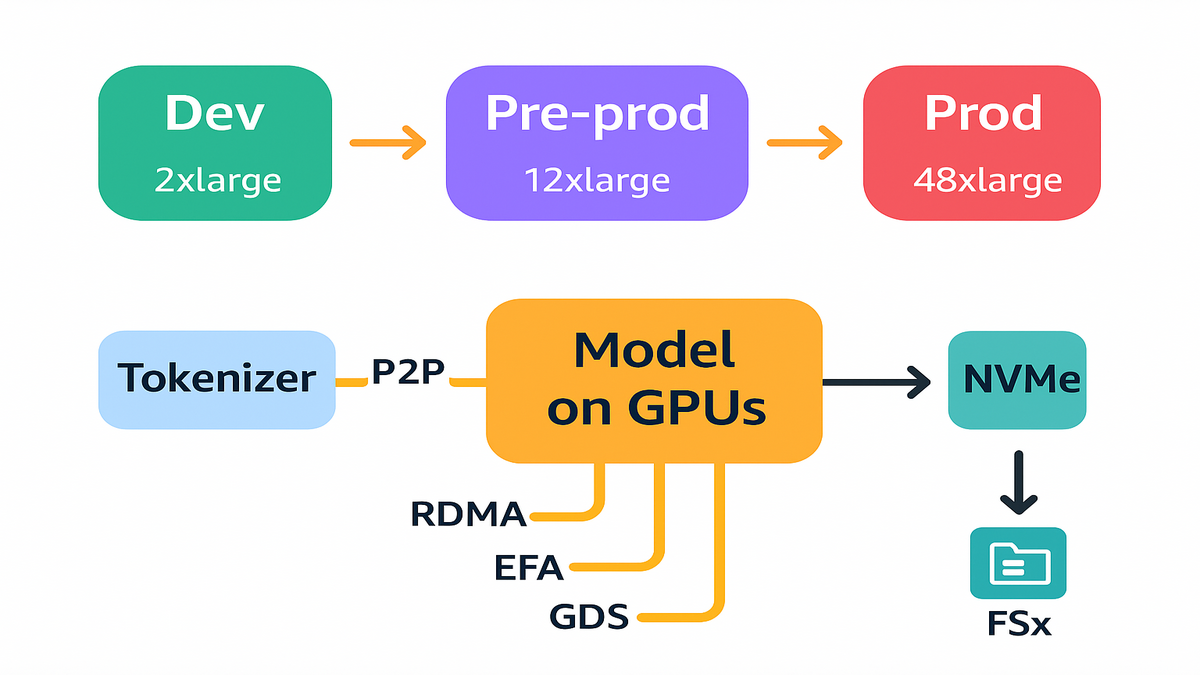Keep the hottest path on-node: tokenizer and model weights on GPUs, vector DB in RAM, assets on NVMe, and GPUDirect P2P for inter-GPU chatter. Use EFA only when you truly need to cross nodes, like bursty peaks, distributed sampling, or finetune phases.