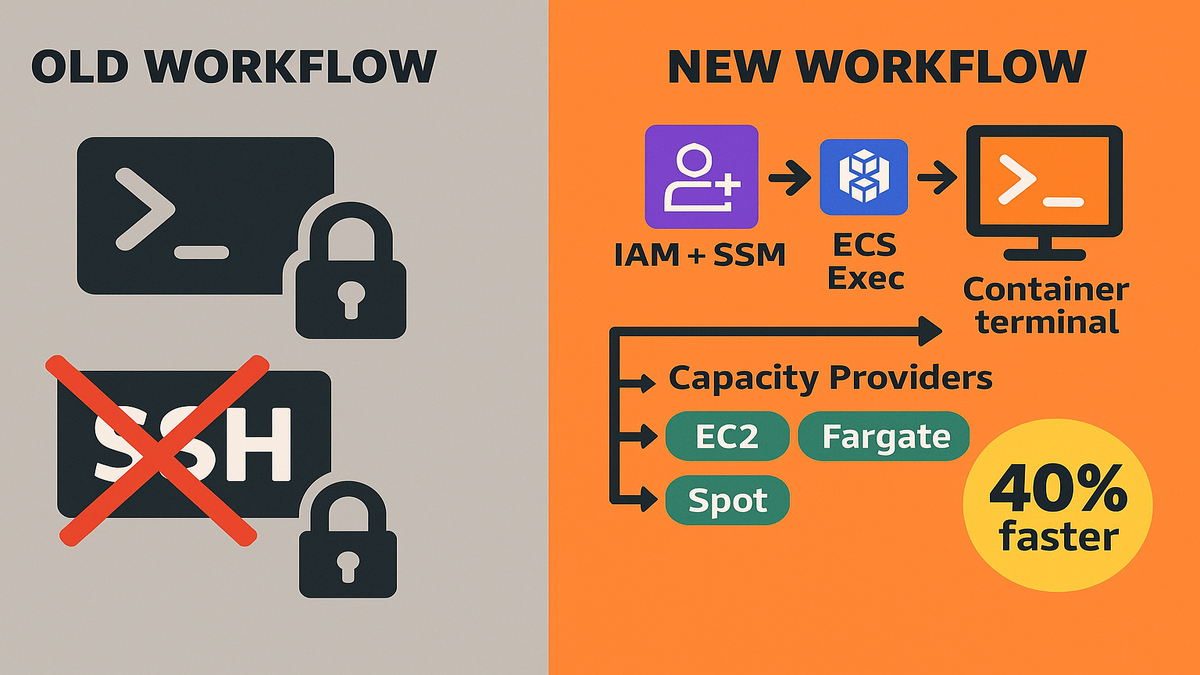 Here’s the big unlock: ECS Exec runs commands inside live containers from console or CLI. No sidecars. No jump boxes. No SSH keys floating around Slack like a compliance time bomb.