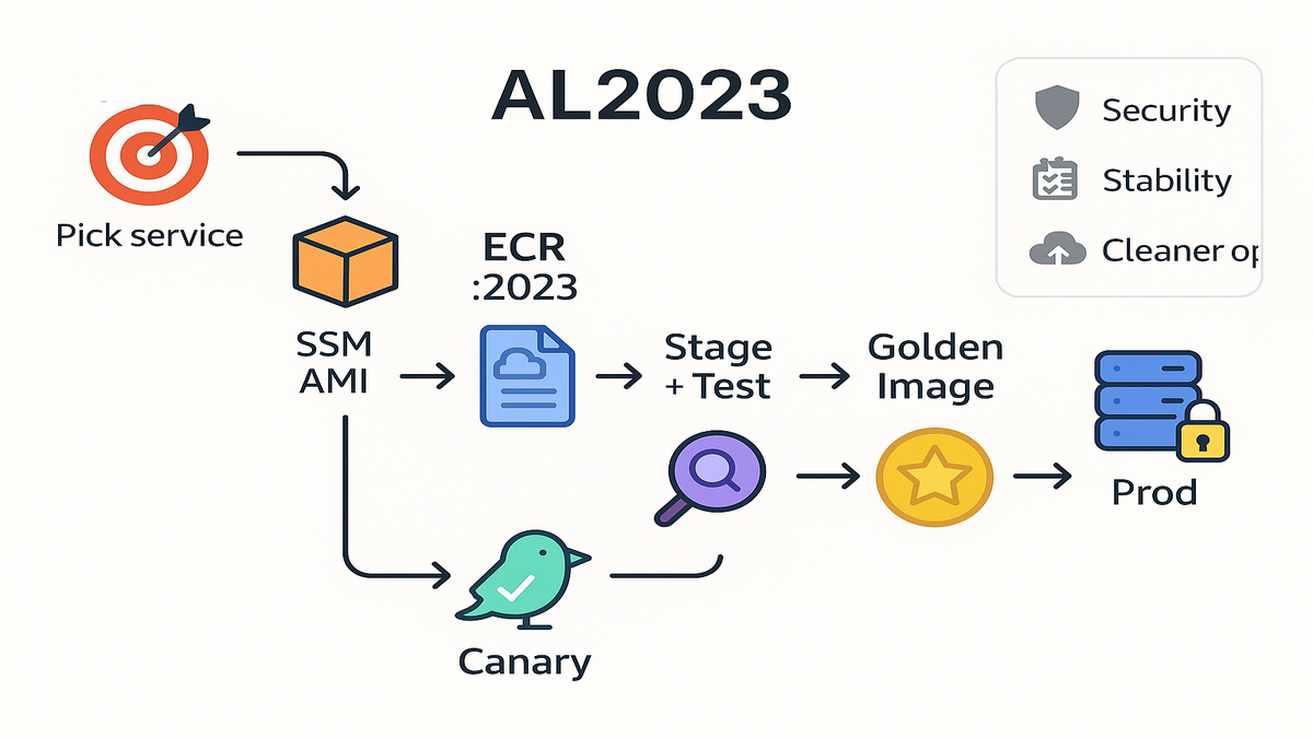 Align with the quarterly AL2023 updates for sane planning. Bake a new golden AMI or container when updates land. Push it through dev and staging with your normal gates. Flip to prod once telemetry looks clean and stable. Smaller changes more often beats big-bang pain every time.
