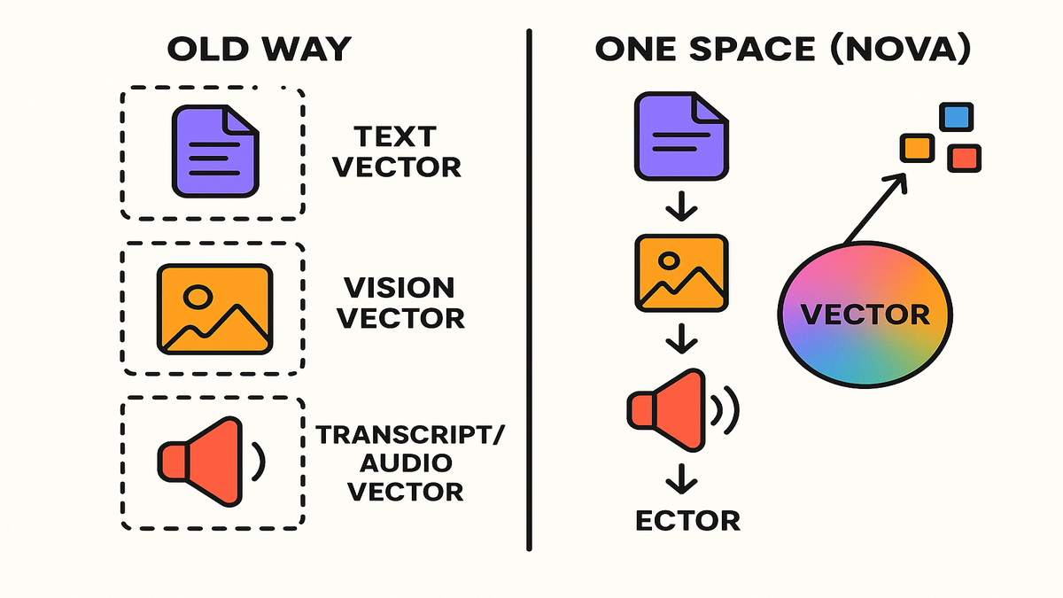 If you’ve tried cross-modal models like CLIP, the intuition will feel familiar. Align text and visuals so similar concepts cluster. The difference is Nova’s scope. Not just images and captions, but documents, audio, and video moments in one space. That unlocks “find the moment,” not just “find the file.”