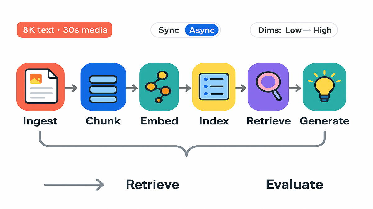 “Asynchronous API for efficient processing of larger files” lets you pipeline ingestion. Detect, extract, chunk, embed, and index. For PDFs, capture images and nearby text together. For videos, align visuals, ASR text, and optional captions per 20–30 second chunk.