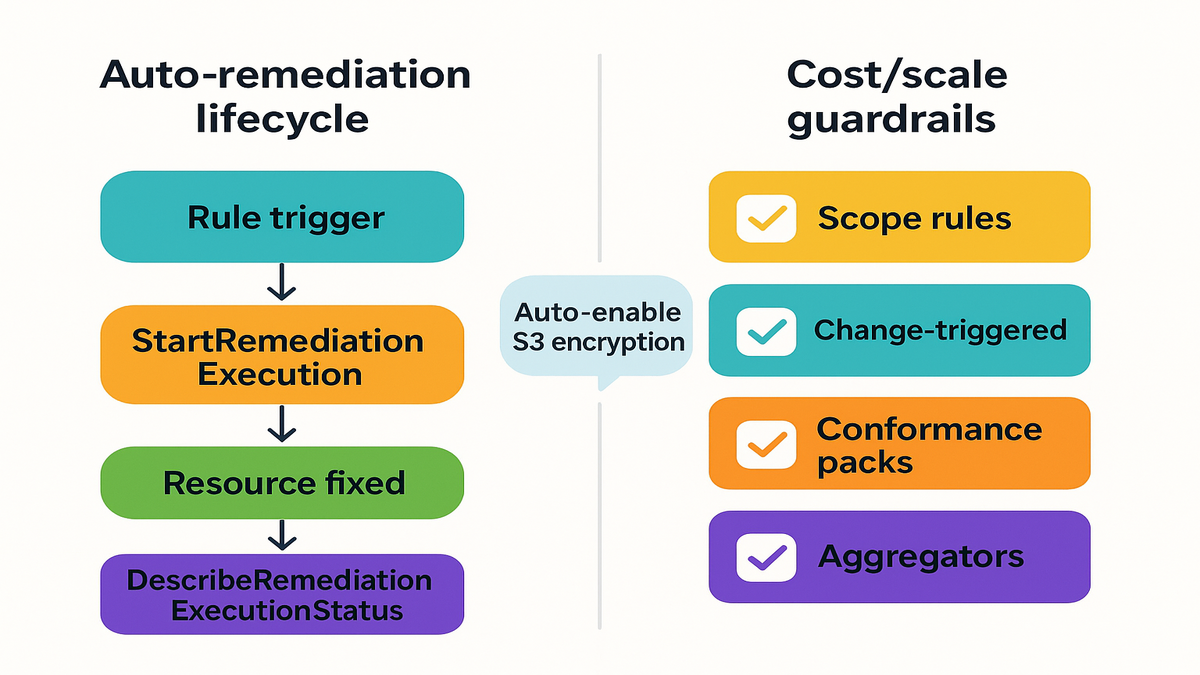 - Example pattern, auto-enable S3 bucket encryption and verify using DescribeRemediationExecutionStatus.