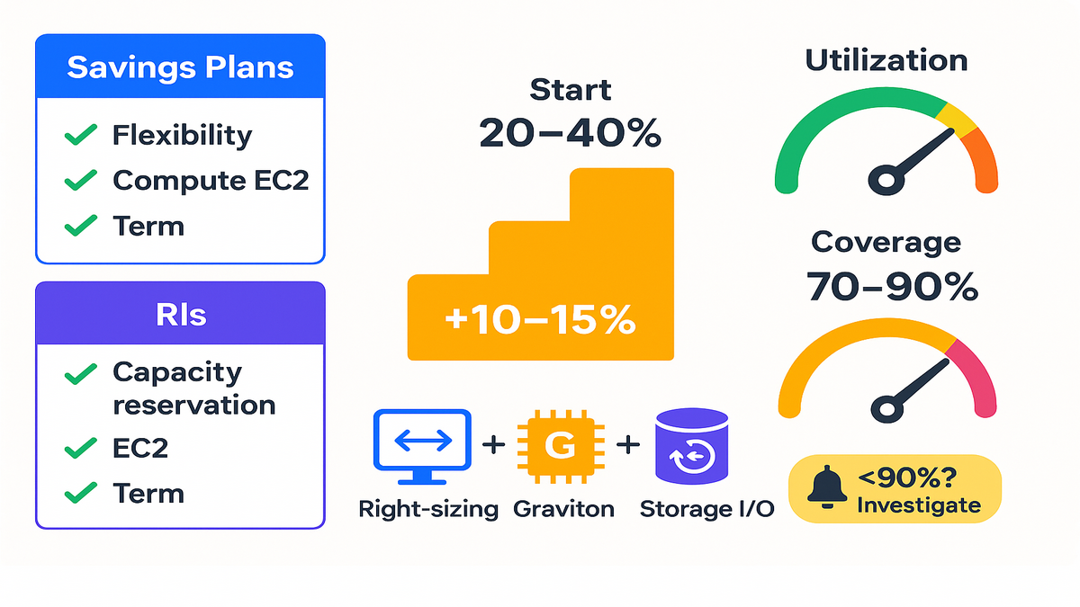 First-hand style example: A team moved Aurora readers to Graviton, dropped two over-sized dev instances, then added a conservative $18/hour plan. Combined outcome beat 30% off on-demand without chasing 50 different RIs.