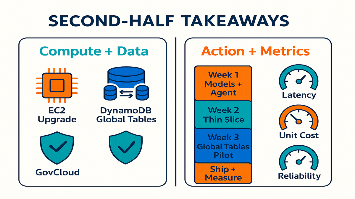 You run a mid-market SaaS. Pre-Summit, you shortlist two Bedrock models and one agent pattern. At the Summit, you hit two chalk talks and a lab. You validate the approach and leave with a working prototype. Two sprints later, your AI assist closes its first upsell. No vanity metrics, just ARR.