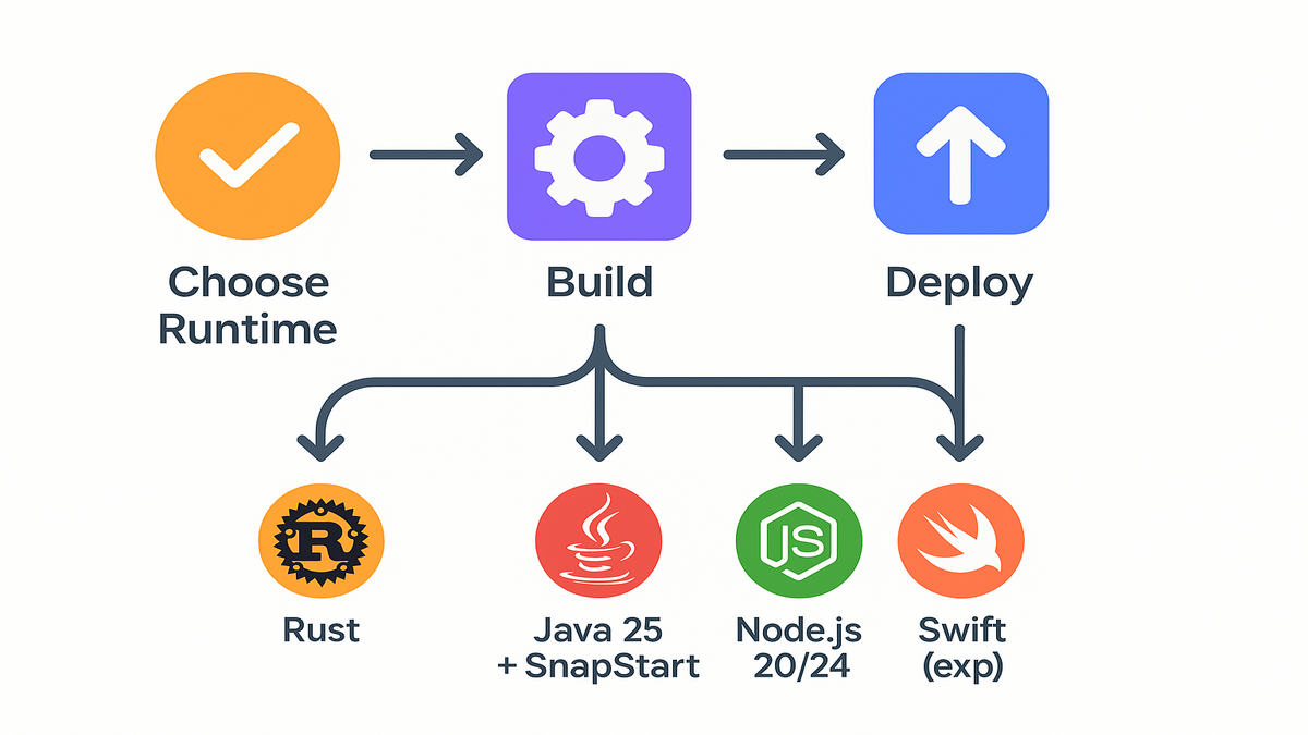 - Decide targets: Rust for CPU-heavy, Java 25 + SnapStart for JVM apps, Node 20 for JS today.