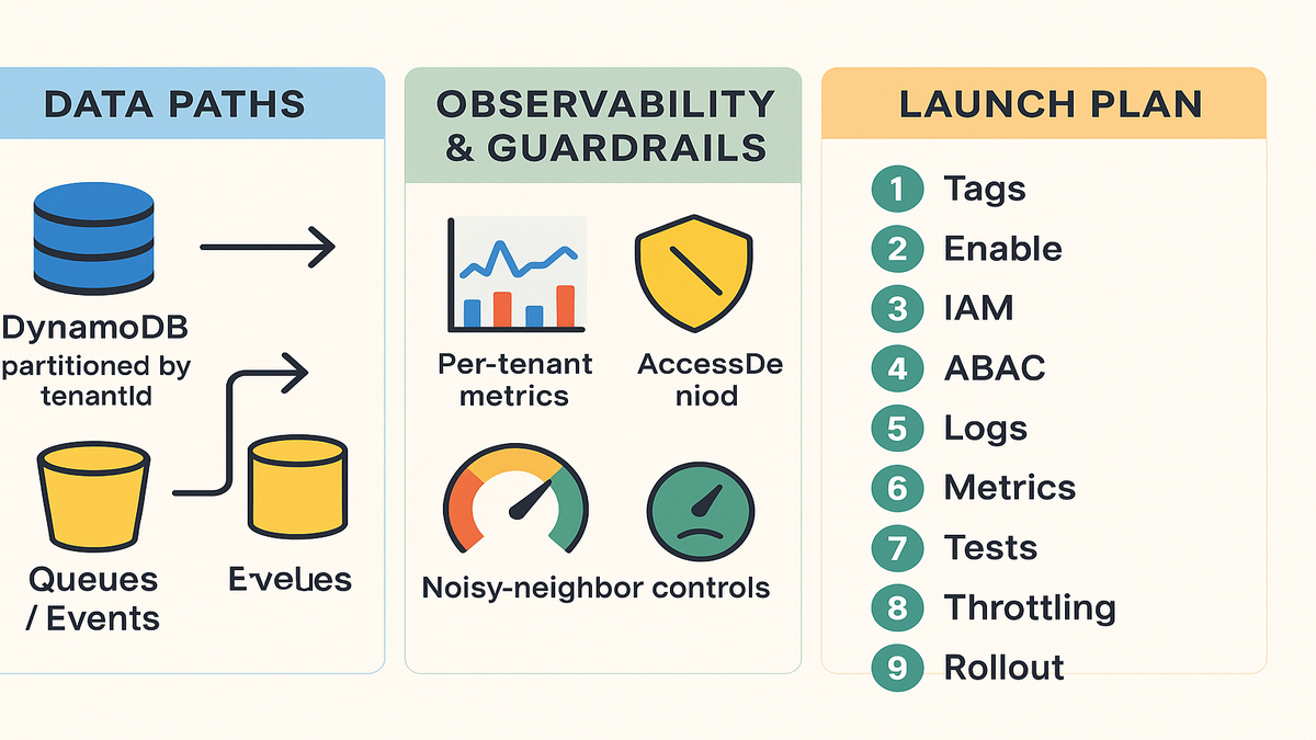 Automate it. A small “tenant factory” creates the IAM role with TenantId. It provisions S3 prefixes, seeds DynamoDB parts, and registers dashboards. The factory logs every step with tenantId for clean audits.