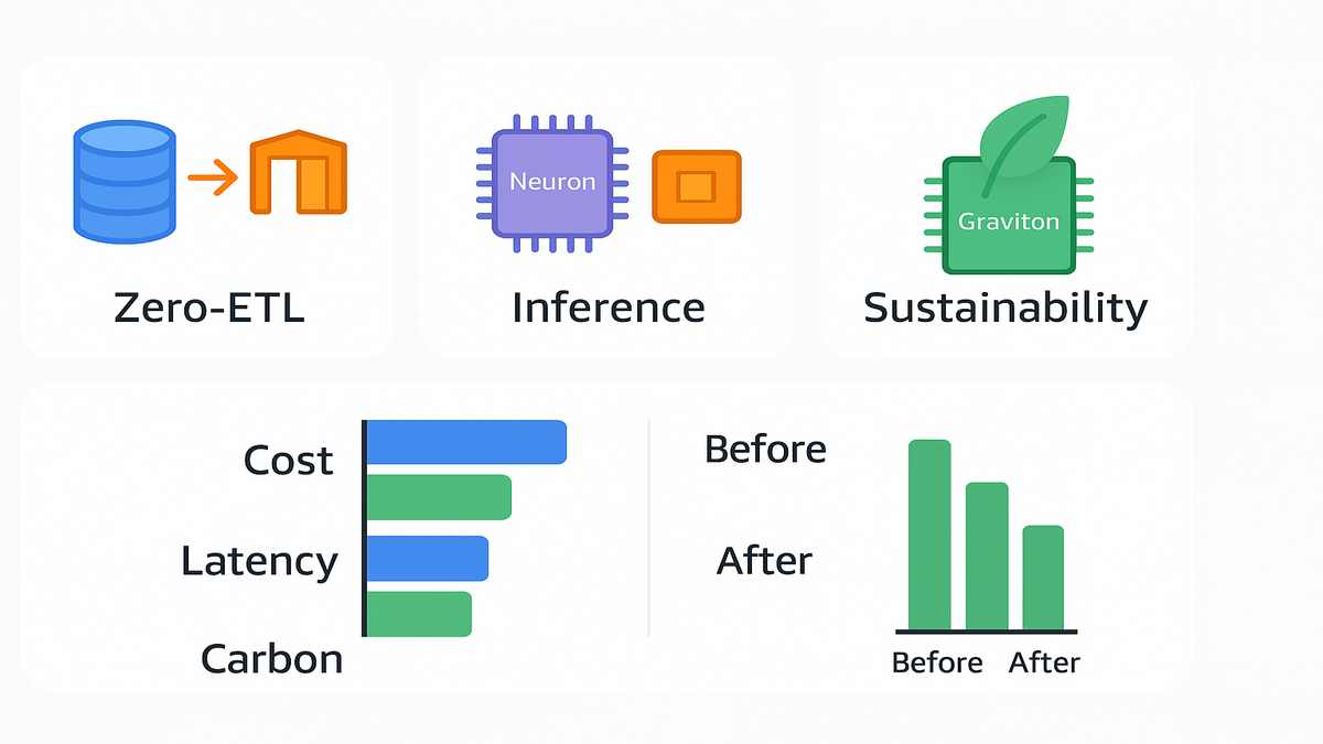 - Sustainable computing is now a performance play: Graviton + efficiency targets push cost and carbon down.
