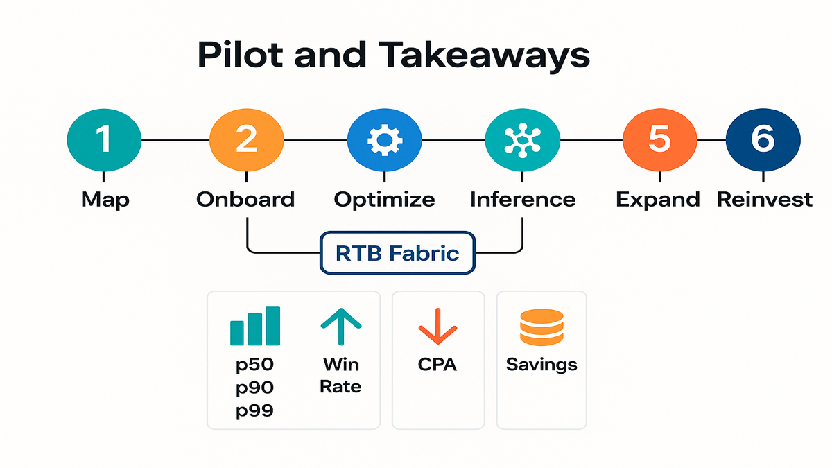 AWS RTB Fabric helps bidders win more auctions by reducing tail latency, stabilizing pacing, and lowering networking costs with dedicated, low-jitter paths and inline processing. It supports per-transaction pricing, containerized apps, and in-path inference for fraud, suitability, and enrichment. Start with a single-partner pilot, measure p50/p90/p99 and timeout rates, then expand methodically and reinvest savings into models and creative experimentation. Key outcomes: higher valid bid rate, more headroom for scoring, smoother delivery, and up to 80% lower networking costs.