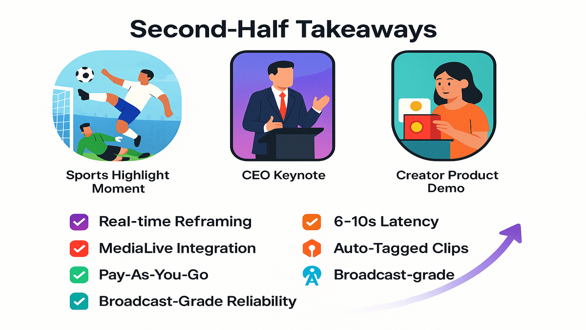 1) Ingest: point your primary 16:9 feed to AWS Elemental MediaLive. 2) Enable AI: turn on Inference for vertical reframing and clip generation. 3) Map outputs: define 9:16 profiles and destinations across platforms. 4) Tag metadata: standardize players, speakers, segments, and timestamps. 5) Test: run a quick rehearsal and verify crops, latency, and audio. 6) Automate: wire MediaPackage, MediaTailor, and your CMS downstream. 7) Go live: monitor key moments and publish clips within seconds. 8) Iterate: review completion rates and repost winners across platforms.