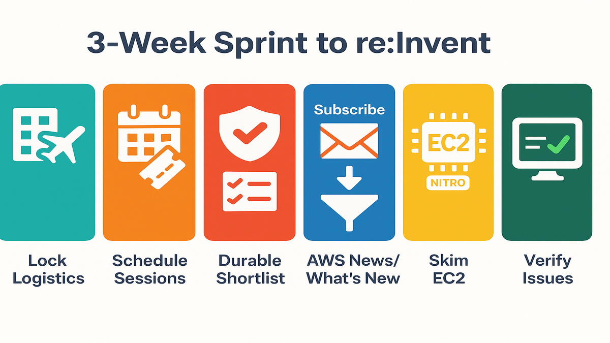 Finalize your schedule, book builder sessions, set up the app, and prewrite your top five questions for AWS solutions architects. Plan two hours for the expo to find partners that remove your biggest bottleneck.