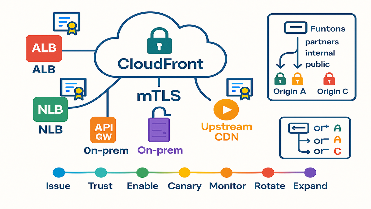 - Test with a known-good client cert; verify rejection on missing or invalid certs. 4) Enable mTLS on the CloudFront origin; canary with a narrow path.