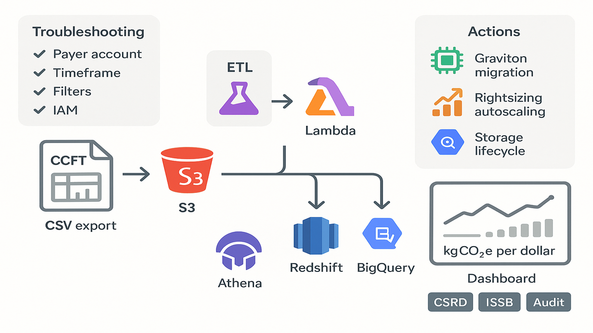 1) Ensure payer-account Billing access; export monthly CCFT CSVs to S3. 2) Build a pipeline: S3 -> Glue or Lambda -> Athena/warehouse -> BI. 3) Join CCFT with CUR tags to split by BU/product; version datasets. 4) Track intensity KPIs: kgCO2e per 1,000 sessions, per transaction, or per $ revenue. 5) Prioritize moves with double wins: rightsizing, instance modernization (e.g., Graviton), storage lifecycle policies, region choices where feasible.