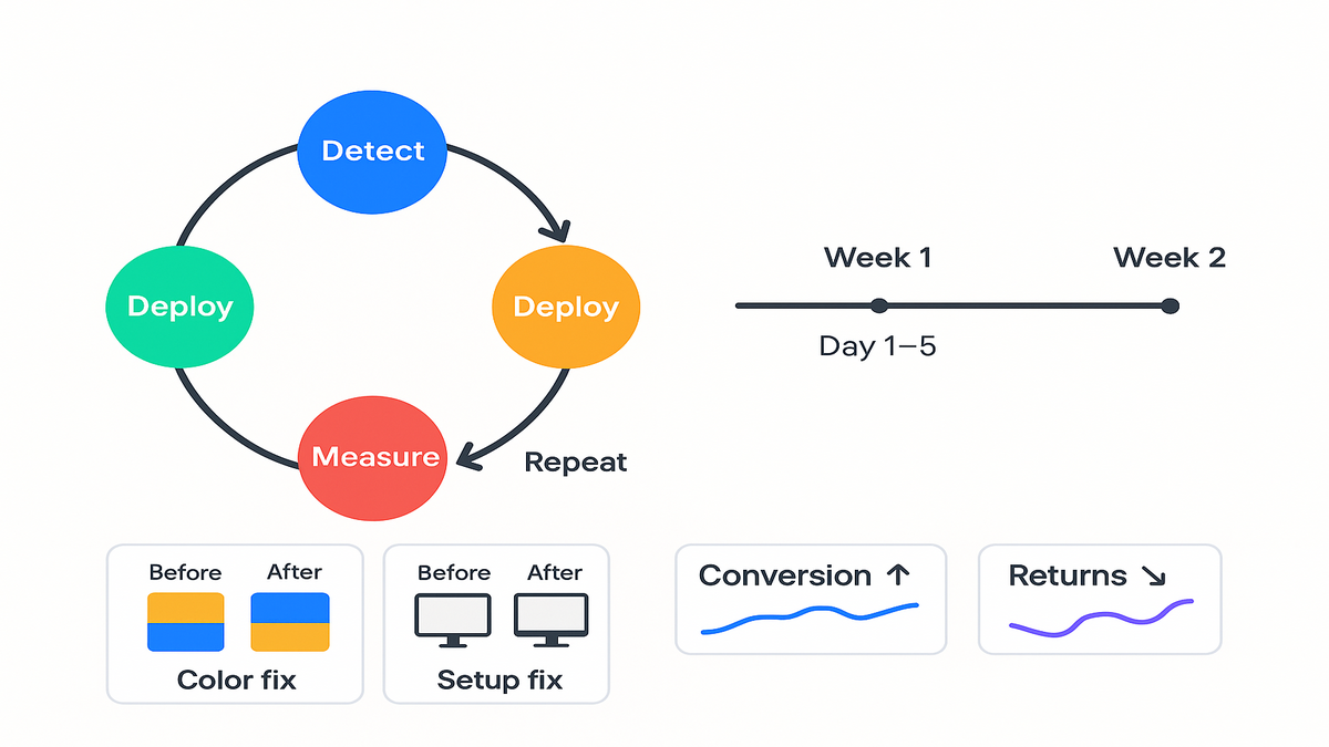 - Week 2: Review movement, scale successful fixes to sibling SKUs, refine misses.