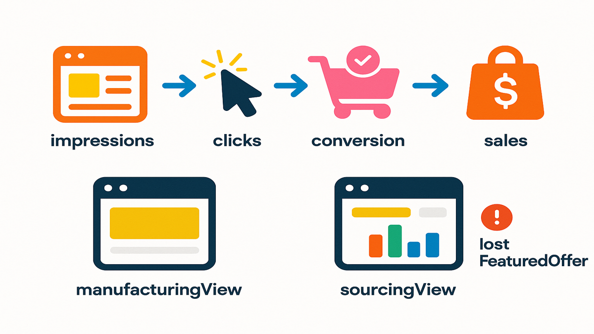 A mid‑market CPG vendor saw flat sales in October. With the new sourcingView traffic, they found glance views rose 18% while lostFeaturedOffer spiked for a week—pricing fell below the floor at a competing seller, knocking them out of the Featured Offer. Fix price, win back the box, conversion normalized. Without traffic + lostFeaturedOffer in sourcingView, they would’ve misdiagnosed it as a demand issue.