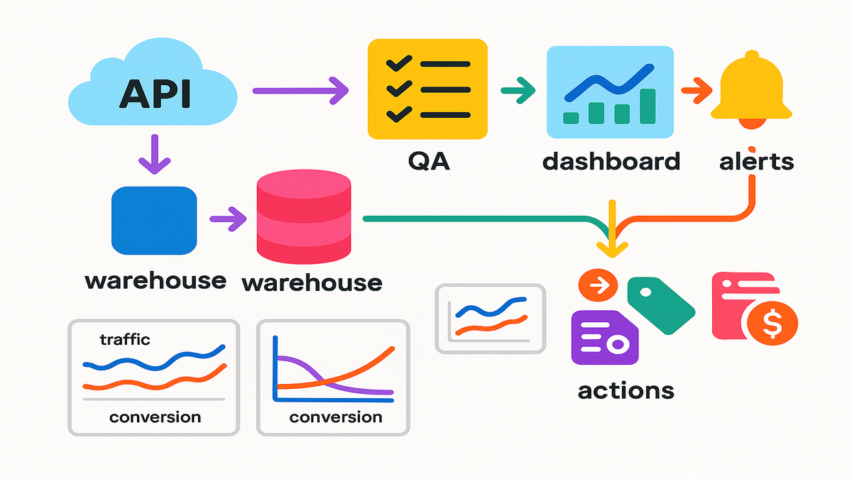 - Start with light QA: confirm joins (ASIN/SKU), date granularity, and marketplace scope before rolling dashboards.