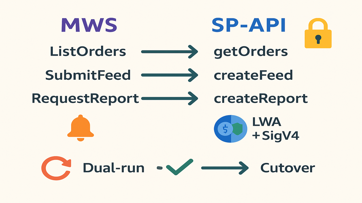 First‑hand example: run a dual pipeline. Keep MWS live and stand up SP‑API beside it. Mirror a slice of traffic. Diff payloads and outcomes. When gaps are near zero for a full sales cycle, flip primary to SP‑API. Keep MWS as fallback for a short, time‑boxed window.