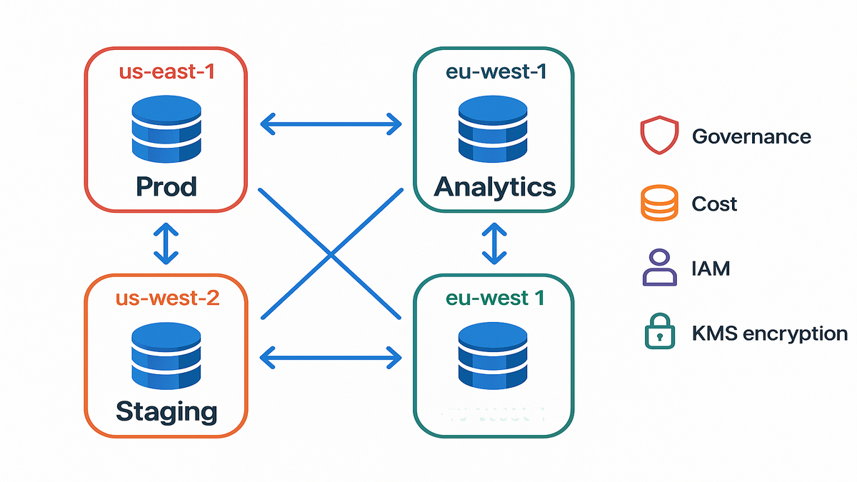 - Cross-account replicas cut blast radius and make budgets clearer.