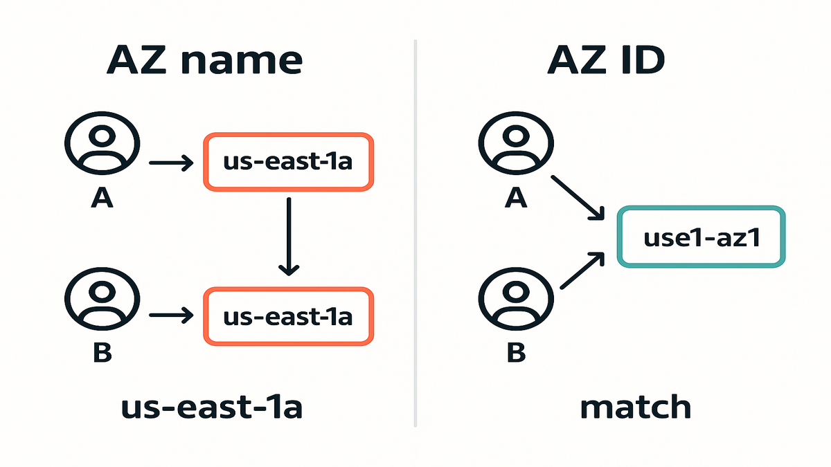 AZ IDs are static, region-scoped identifiers like “use1-az1.” They represent the actual physical zone and stay consistent across accounts. If you launch with the same AZ ID in two accounts, you land in the same place. That’s the key to reliable co-location in multi-account designs.