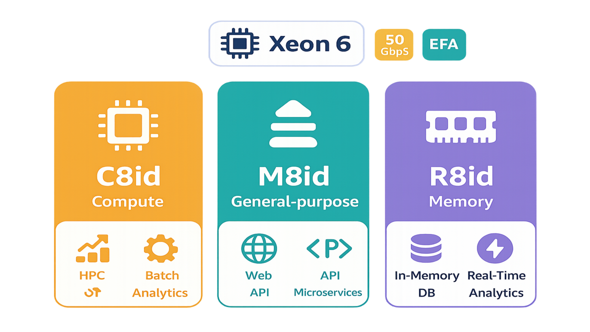 • C8id = compute-heavy, M8id = general-purpose, R8id = memory-intensive.
