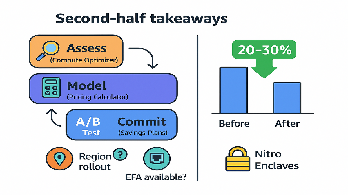 One more thing before we dive in: you’re not betting the farm. Start with one service, compare cost-per-request and p95 latency. Move on only if the numbers sing. In minutes, you’ll see where each family fits, how to wire up EFA and Enclaves without drama, and a simple two-day test plan to prove results to your CFO.