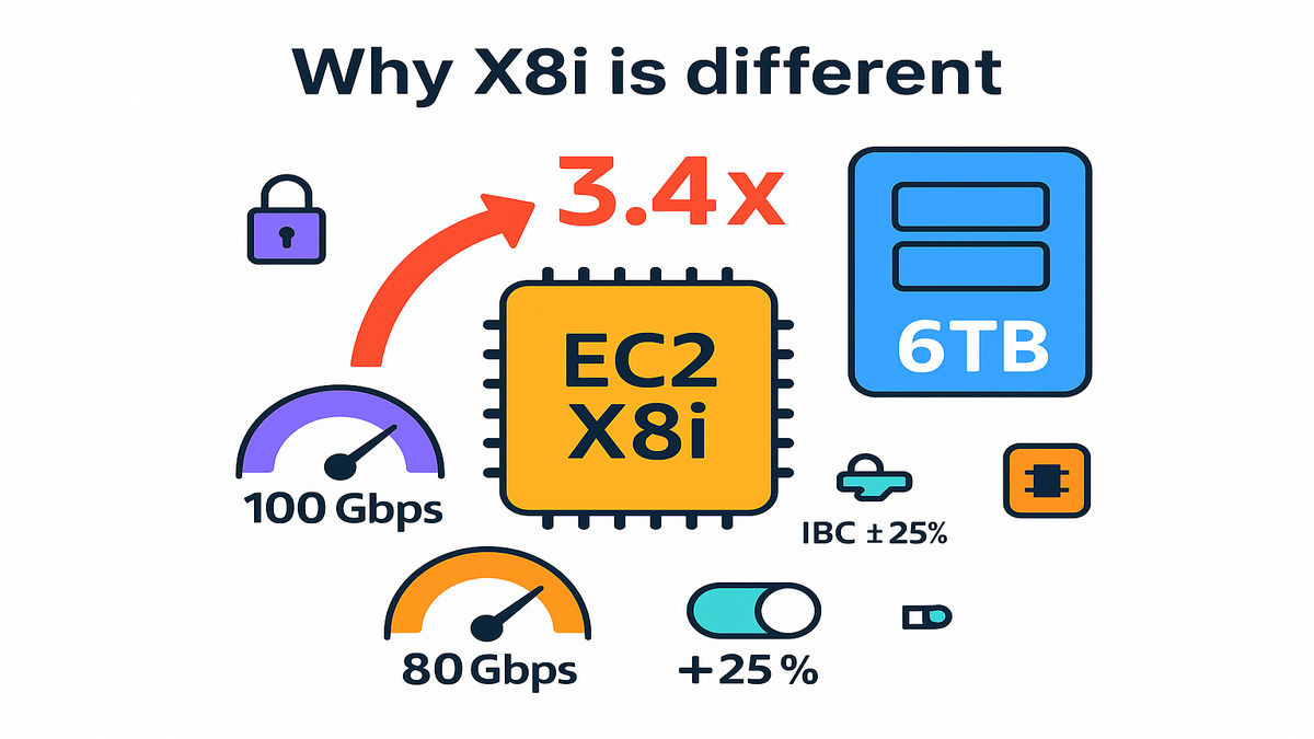 More headroom and a fatter pipe. X8i delivers up to 43% higher overall performance. It has up to 3.4x higher memory bandwidth and scales to 6TB per instance. If you’re memory bound, you’ll see quick wins with fewer nodes.