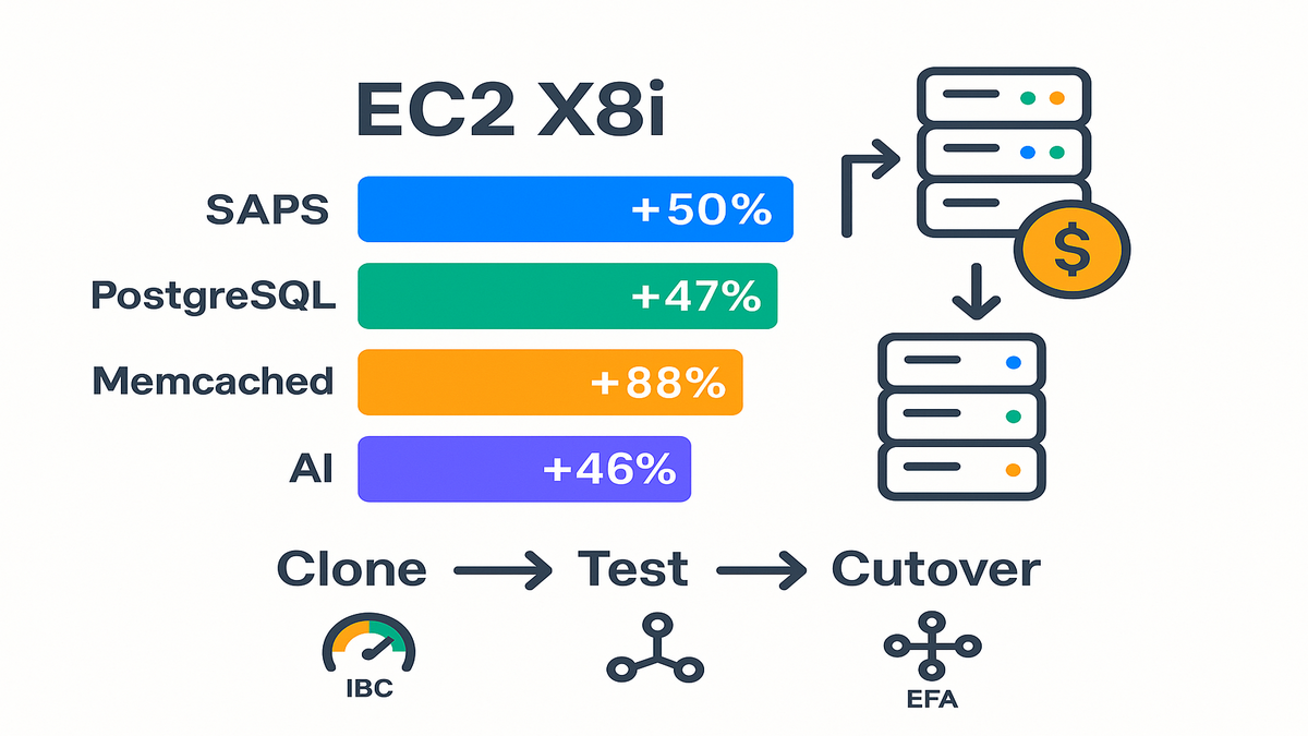 AWS reports up to 50% higher SAP Application Performance Standard (SAPS) versus X2i. X8i is SAP-certified for mission-critical deployments. That matters because SAP HANA is both bandwidth-hungry and latency-sensitive. Net effect: simpler clusters with fewer nodes and less cross-node chatter.