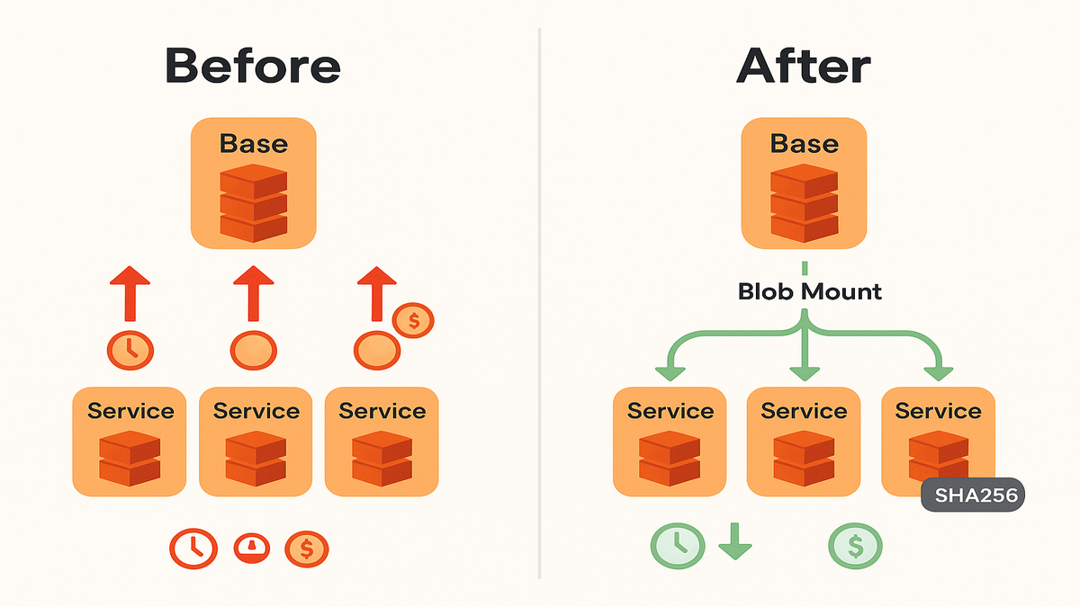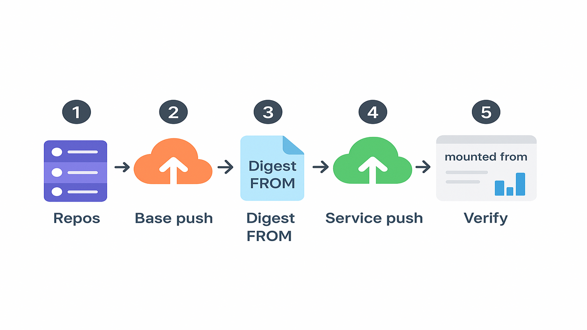 - Push once, reuse everywhere: service repos mount base layers instead of uploading them again.