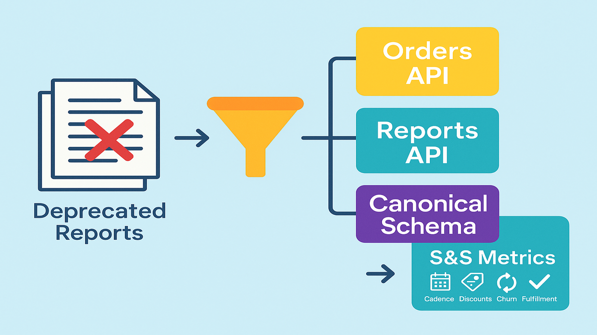 Not necessarily. In many cases, you’ll rebuild S&S visibility by combining supported Reports API exports, Orders API data, and your internal warehouse modeling. The safer approach is to model a canonical subscription dataset and plug multiple sources into it.