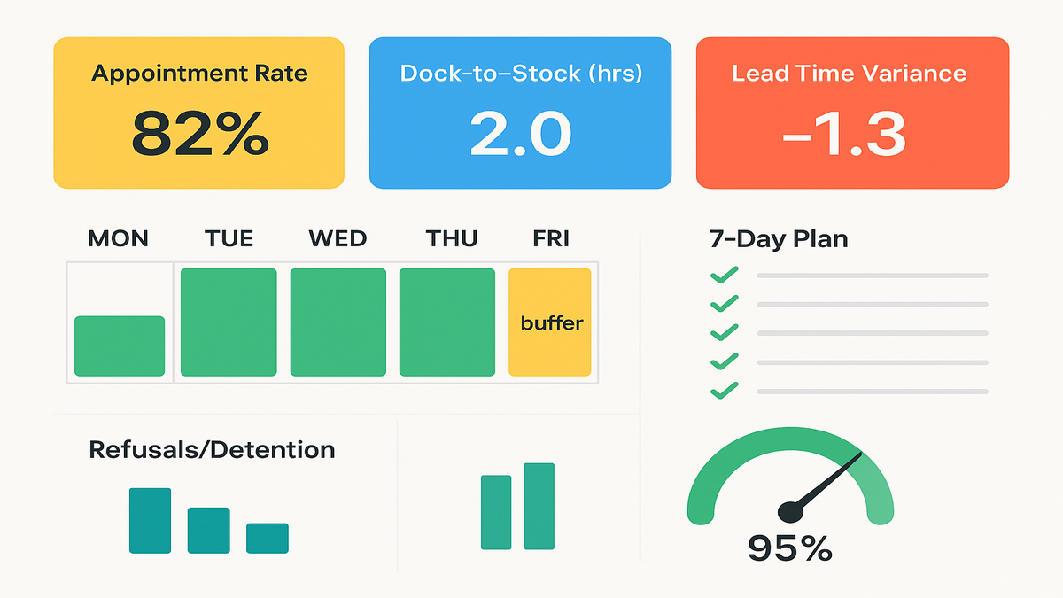 - Day 7: Review KPIs like appointment rate and dock-to-stock, then adjust windows.