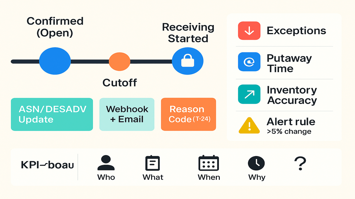 Set a tight notification protocol. Emit an event immediately and regenerate the ASN or DESADV. Notify the 3PL via webhook plus email backup. Require a reason code for edits inside a 24-hour window. If receiving has already started, lock corrections. Manage differences as dock-side exceptions.