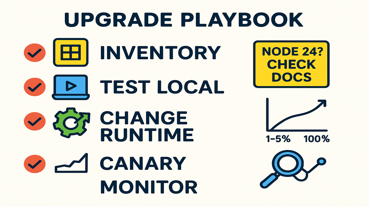 - Upgrade playbook: inventory, test locally, change runtime via console or IaC, canary, monitor, repeat.