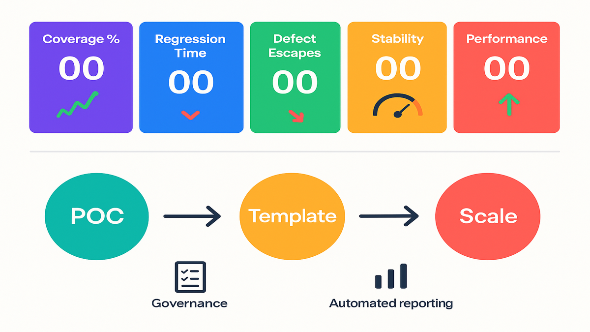 - Track defect escape rate, coverage, and regression time to show ROI.