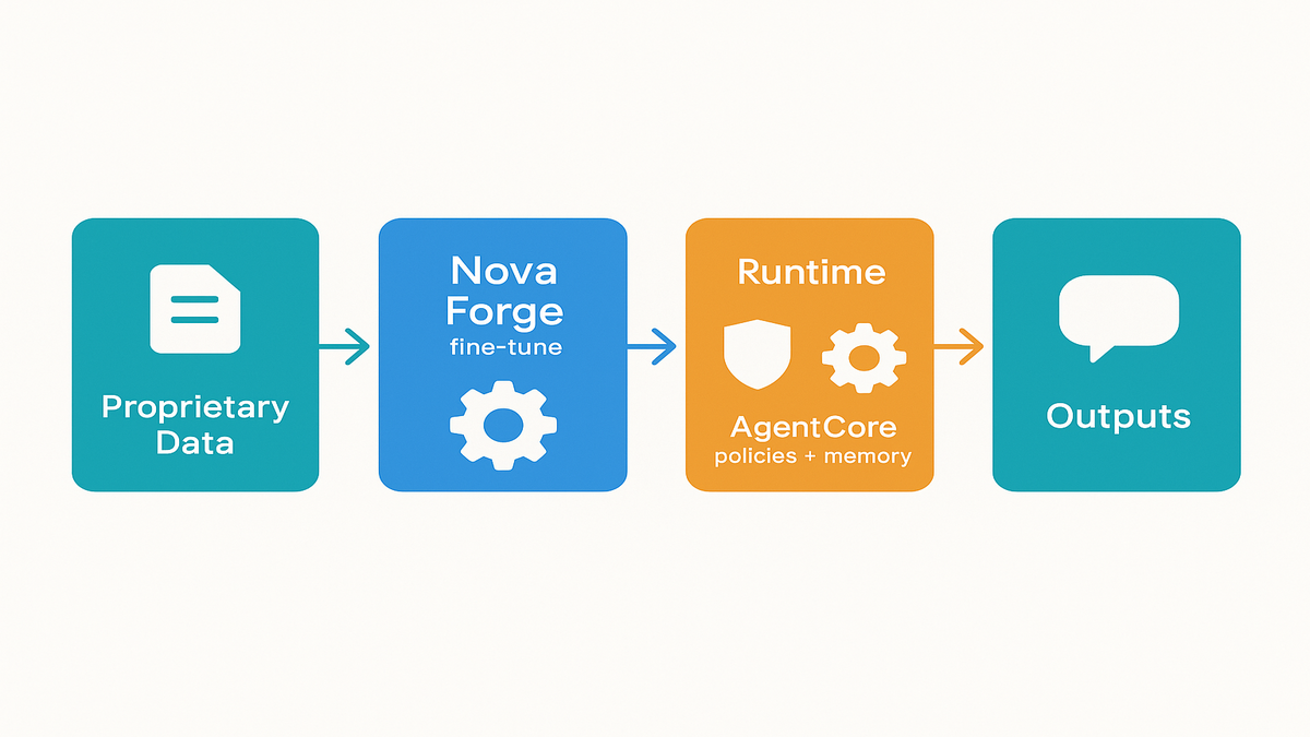 Nova Forge lets you fine-tune Nova LLMs on your own data. The value: move past prompt spaghetti and encode your domain—terms, formats, decisions—straight into weights. You cut prompt length, boost consistency, and make the model “think like your org.”