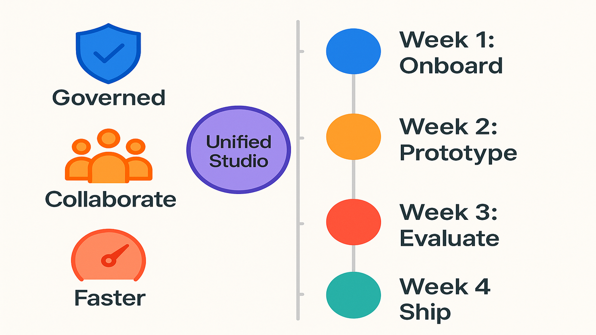 Pilot Unified Studio on a single high-value use case, like churn prediction. Or forecasting and cost analytics. The goal isn't a science project; it's a production path.