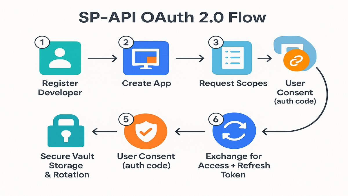1) Register as an SP-API developer. 2) Create and configure your SP-API application. 3) Link the right Vendor Central credentials so your app accesses the correct vendor groups. 4) Implement OAuth 2.0 authorization code flow. 5) Request only the scopes you need; use Restricted Data Tokens (RDT) for sensitive endpoints. 6) Store and rotate tokens securely.