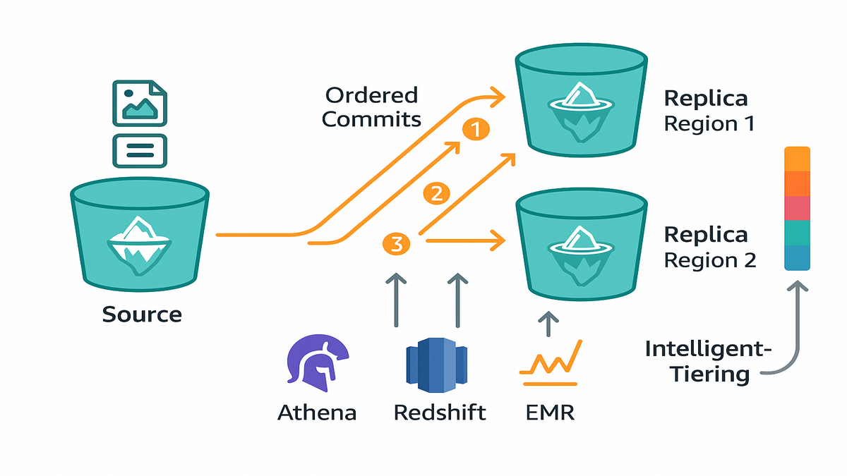 A common pattern: write in Region A on the hot path. Replicate to Regions B and C as read-only. Analytics teams in B and C point Athena or EMR to the local replica for routine reports. If Region A has issues, promote a replica per your governance playbook. Keep calm. Because replication preserves commit order, readers don’t see partial states.