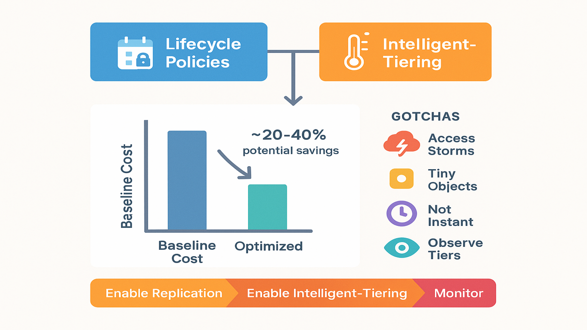 - Use lifecycle for deterministic retention; Intelligent-Tiering for dynamic tiering.