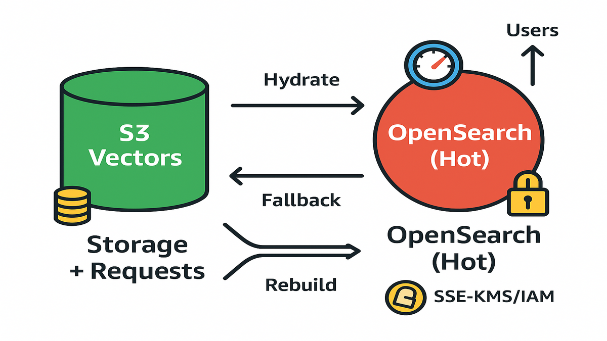 - Use a two-tier design. S3 Vectors is source-of-truth. OpenSearch is the hot cache.
