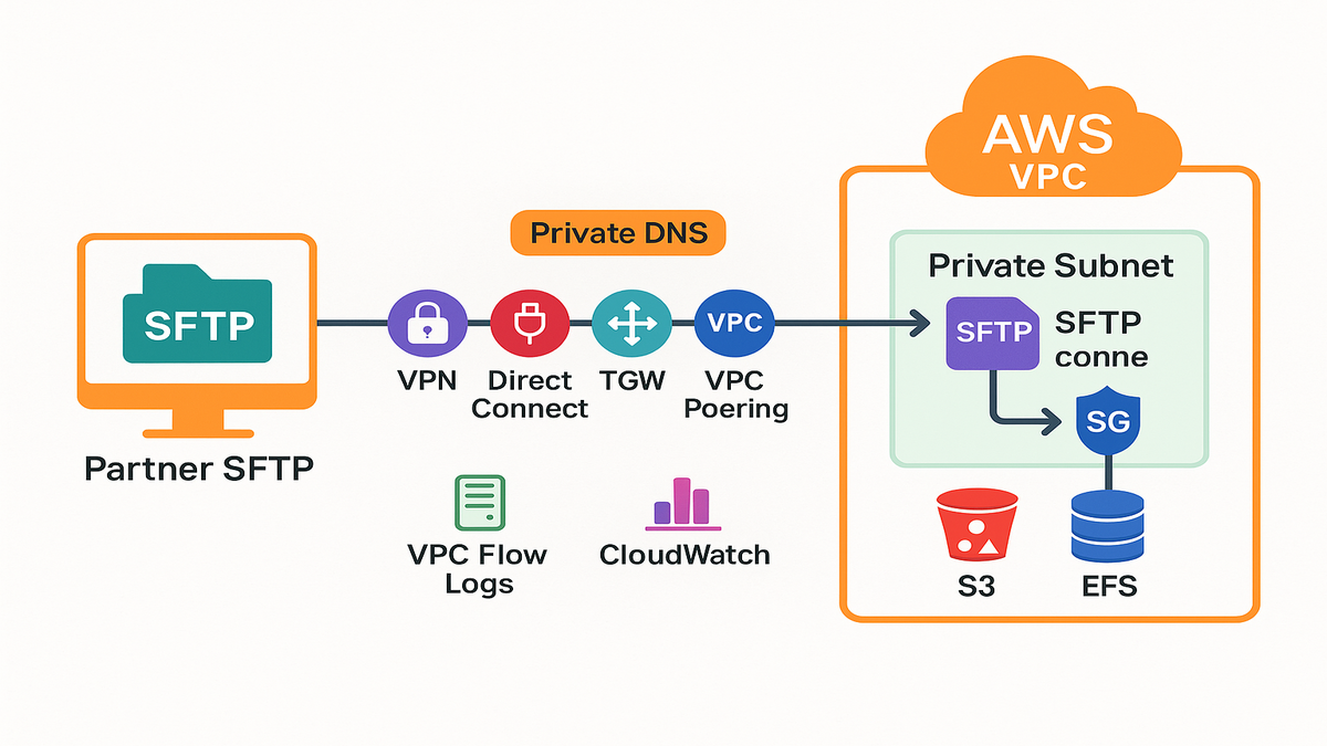 - Place connectors in private subnets and lock down egress in security groups. Use TCP 22 for SFTP; for FTP include only the partner’s passive port range.