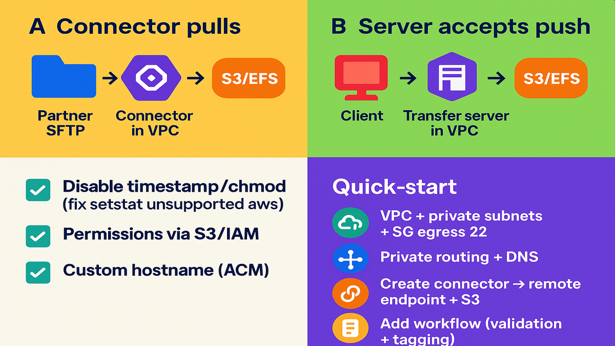 1) Pick a VPC, private subnets, and a tight egress-only security group. 2) Configure private routing and DNS resolution to the partner endpoint. 3) Create a connector targeting the partner and an S3 destination. 4) Add a workflow for validation and tagging, simple and clear. 5) Test with a small file and review CloudWatch and VPC Flow Logs.