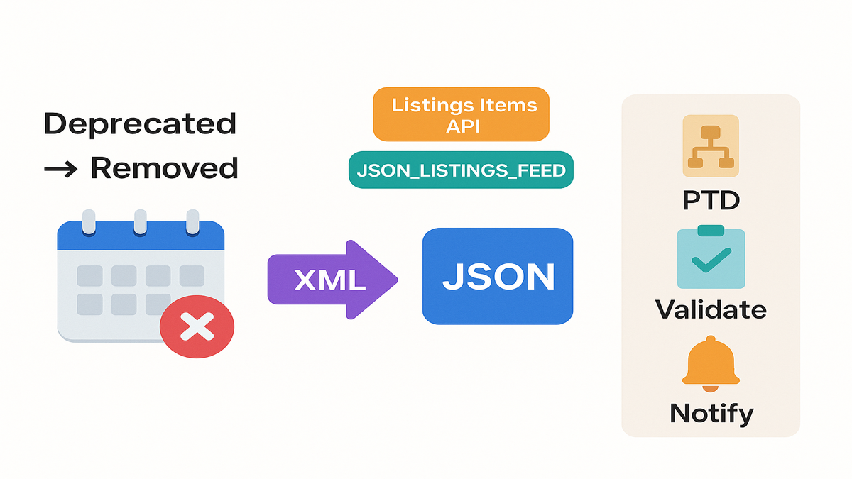 Amazon deprecated XML and flat file listing inputs in favor of JSON via Listings Items APIs or the JSONLISTINGSFEED submitted through the Feeds API. This touches pricing, inventory, relationships, images, and attribute-rich product data.