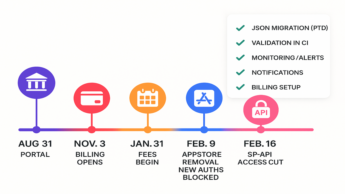 - August 31, 2025: Existing SP-API developers migrate operations to the Solution Provider Portal.