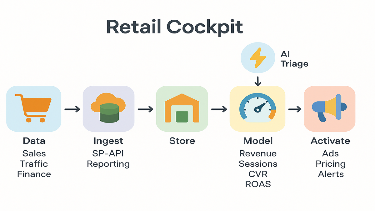 - Model: Materialize KPI views—sales velocity, glance views, ROAS, ship-ready units, and contribution margin.