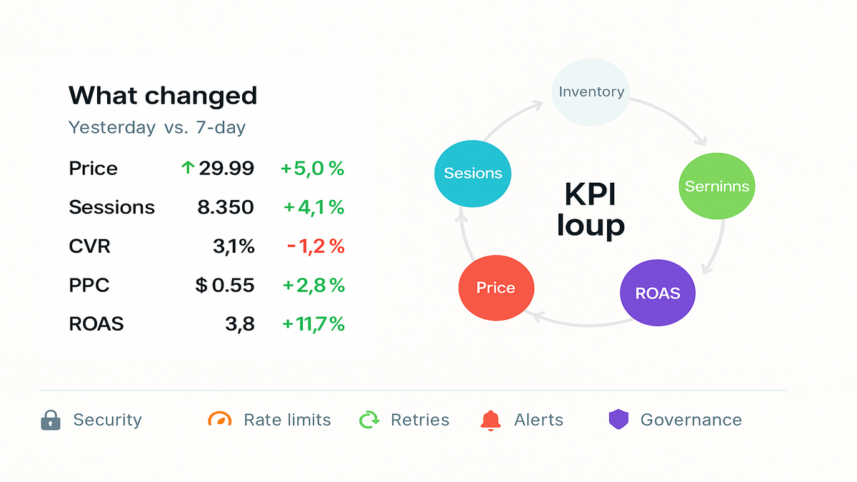 Mental model: Reporting API is sensors; AI is triage. You’re still the pilot. You choose when to change price, pause a keyword, or pull a listing for fixes. Guardrails matter—cap daily budget deltas and require review for high-impact changes. Log every accepted nudge for post-mortems later.