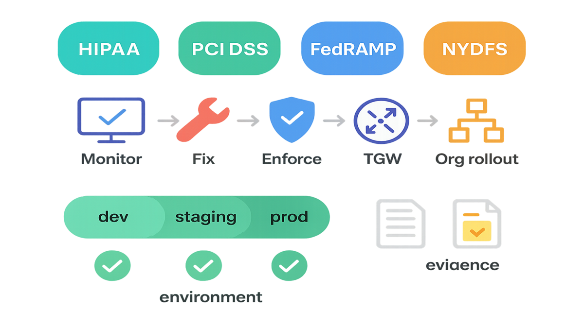 First-hand example: a healthcare team in a multi-account setup enabled monitor in dev, found an ALB listener exposing HTTP from a migration, switched to HTTPS with TLS 1.2+, validated zero plaintext for a week, then enforced across dev, stage, and prod in waves.